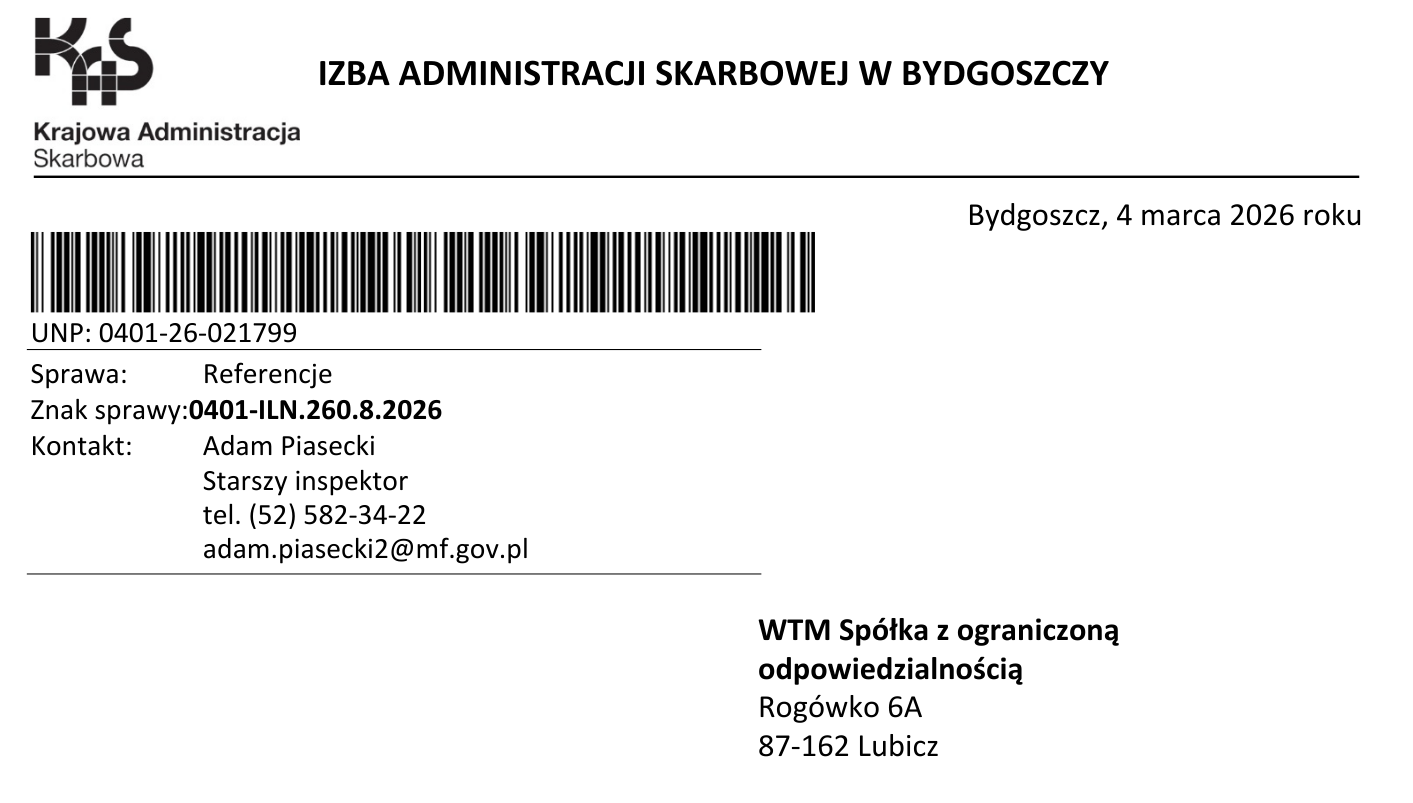Izba Administracji Skarbowej w Bydgoszczy rekomenduje firmę WTM Spółka z ograniczoną odpowiedzialnością jako solidną, wiarygodną, w pełni przygotowaną do kompleksowej realizacji zadania polegającego na budowie hali magazynowej wraz z budynkiem biurowym, zarówno w budynkach użyteczności publicznej jak i prywatnej działalności.”