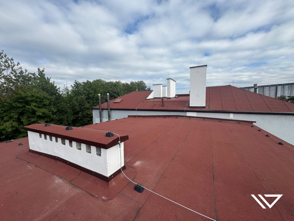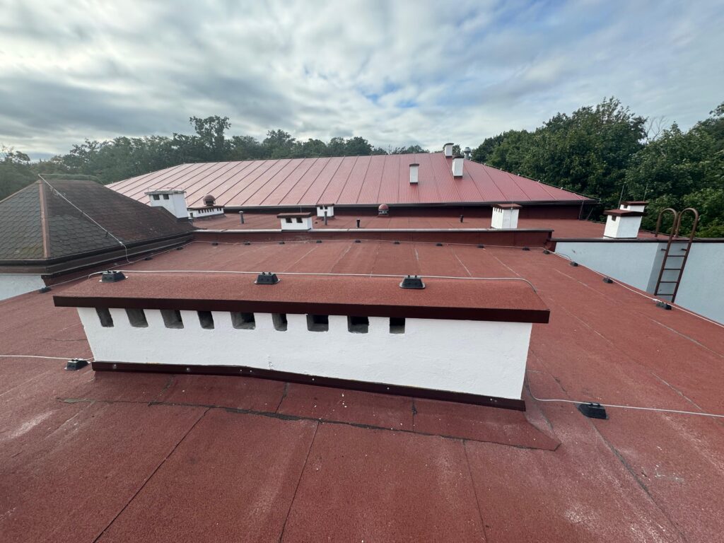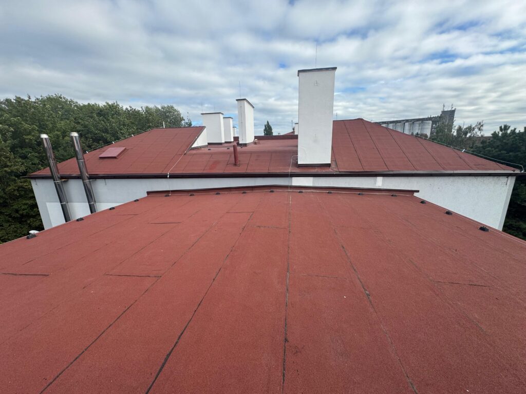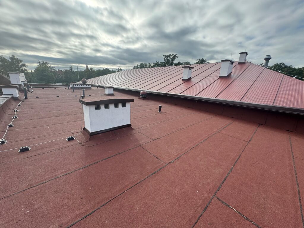 Zakres prac obejmował demontaż starego pokrycia i orynnowania, wykonanie nowej izolacji termicznej i przeciwwodnej, pokrycia z papy, obróbek, rynien oraz instalacji odgromowej. Odnowiono także kominy i zamontowano wyłazy dachowe.